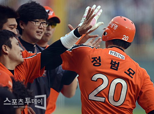 [스포츠투데이 정재훈 기자] 2일 오후 잠실야구장에서 열린 '2012 팔도 프로야구' LG 트윈스와 한화 이글스의 경기 6회초 선두타자 정범모가 솔로홈런을 터뜨린 후 동료들의 축하를 받고 있다.스포츠투데이 정재훈 사진기자 roze@<ⓒ아시아경제 & 재밌는 뉴스, 즐거운 하루 "스포츠투데이(stoo.com)">