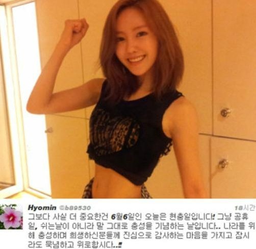 [아시아경제 온라인이슈팀]티아라 멤버 효민의 개념발언이 화제다. 효민은 6일 트위터에 "6월6일인 오늘은 현충일입니다! 그냥 공휴일, 쉬는 날이 아니라 말 그대로 충성을 기념하는 날입니다"라며 "나라를 위해 충성하며 희생하신 분들께 진심으로 감사하는 마음을 가지고 잠시라도 묵념하고 위로합시다…!"라는 글을 남겼다. 특히 효민은 자신의 트위터 프로필 사진을 무궁화로 바꿔 네티즌들을 감동시켰다.효민은 그동안 사회적으로 민감한 사안이나 국가와 관련된 일과 관련한 개념 발언을 서슴지 않았다. 최근에는 일본 네티즌이 뚜껑에 라면을 덜어먹는 한국인을 야만스럽다고 비난하자 "라면은 뚜껑에 덜어먹어야 제맛"이라는 트윗을 올리기도 했다. 또 효민은 서울시장 보궐선거 및 4.11 총선 후 투표 인증샷을 트위터에 올리는 등 연예인이 아닌 한 국민으로써 모범을 보이고 있다.한편 효민이 속한 티아라는 7월 국내 컴백을 앞두고 있으며 19일부터 일본 6개 지역을 도는 대규모 투어 콘서트를 진행한다.온라인이슈팀 <ⓒ세계를 보는 창 경제를 보는 눈, 아시아경제(www.asiae.co.kr) 무단전재 배포금지>