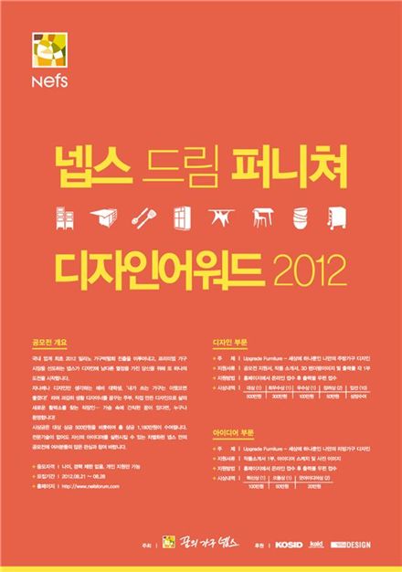 [아시아경제 이승종 기자] 디자인을 중요시한 스티브 잡스의 열정은 익히 알려진 바다. 가구업체 넵스가 일반 소비자를 대상으로 디자인 공모전을 개최한다. 7일 넵스는 ‘넵스 드림 퍼니쳐 디자인 공모전’ 출품작을 오는 8월 21~28일 공모전 홈페이지(www.nefsforum.com)를 통해 모집한다고 밝혔다. 대학생, 주부, 직장인 등 남녀노소 누구나 지원 가능하다. 디자인 범위는 주방가구, 리빙가구 등이다. 디자인 작품을 첨부해야 하는 ‘디자인 부문’ 외에도 스케치만으로도 지원 가능한 ‘아이디어 부문’이 있어 전문 기술이 없어도 누구나 참여 가능하다는 게 넵스 측 설명이다. 양 부문을 통틀어 총 19명의 수상자를 선정하며 대상 500만원을 비롯, 총 시상금이 1190만원에 달한다. 9월경 합격자를 발표하고 같은 달 18일 시상식이 열린다. 넵스 관계자는 “넵스는 사내 직원이나 주부를 대상으로 하는 리서치를 통해 얻은 아이디어를 제품에 반영한 사례가 있다”며 공모전의 중요성을 강조했다. 자세한 내용은 공모전 홈페이지에서 확인 가능하다. 문의는 1566-2300이승종 기자 hanarum@<ⓒ세계를 보는 창 경제를 보는 눈, 아시아경제(www.asiae.co.kr) 무단전재 배포금지>