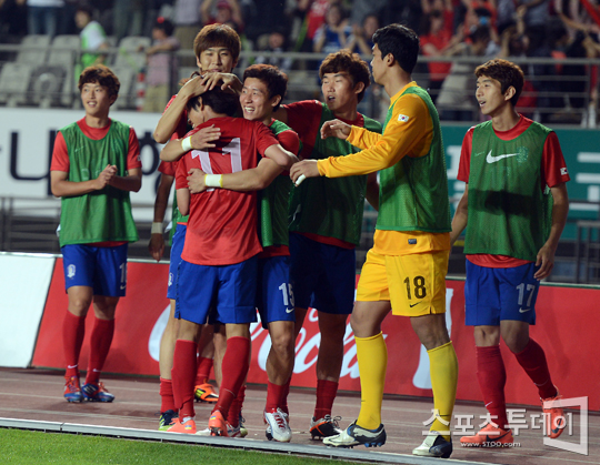 [화성=스포츠투데이 정재훈 기자] 7일 오후 화성종합경기타운에서 열린 '하나은행 초청 올림픽대표팀 친선경기' 한국과 시리아의 경기에서 추가골을 터뜨린 윤일록이 동료들과 기쁨을 나누고 있다.스포츠투데이 정재훈 사진기자 roze@<ⓒ아시아경제 & 재밌는 뉴스, 즐거운 하루 "스포츠투데이(stoo.com)">