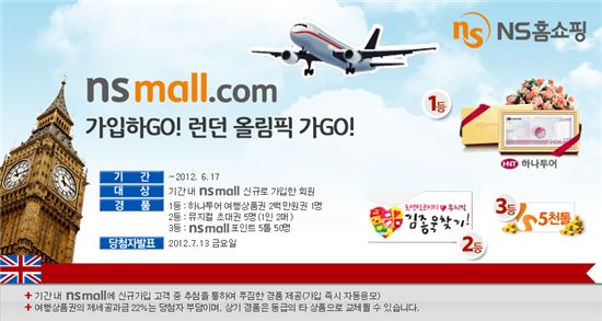 '가입하GO 런던 올림픽 가GO' 이벤트는 NS몰에 신규 가입하면 가입과 동시에 자동 응모된다. 또 상품을 구매 할 경우구매 건수가 높을수록 당첨 확률이 높아지며, TV쇼핑 상품을 미리 문자로 알려주는 ‘방송알리미’를 신청할 경우에도 자동 응모된다. 추첨을 통해 1등 1명에게 하나투어 여행상품권 200만원권이 제공되며, 2등 5명에게는 뮤지컬 김종욱찾기 초대권(1인 2매)이, 3등 50명에게는 NS몰에서 현금처럼 사용가능한 적립금 '5000톨'이 주어진다. 당첨자는 다음달 13일 NS몰 게시판을 통해 발표된다. 이윤재 기자 gal-run@<ⓒ세계를 보는 창 경제를 보는 눈, 아시아경제(www.asiae.co.kr) 무단전재 배포금지>