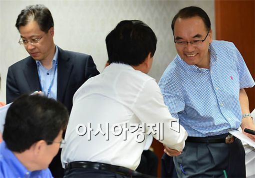 [아시아경제 양지웅 기자] 박재완 기획재정부 장관과 서규용 농림수산식품부 장관이 13일 서울 세종로 정부중앙청사에서 열린 위기관리대책회의에서 악수를 나누고 있다. 양지웅 기자 yangdoo@<ⓒ세계를 보는 창 경제를 보는 눈, 아시아경제(www.asiae.co.kr) 무단전재 배포금지>