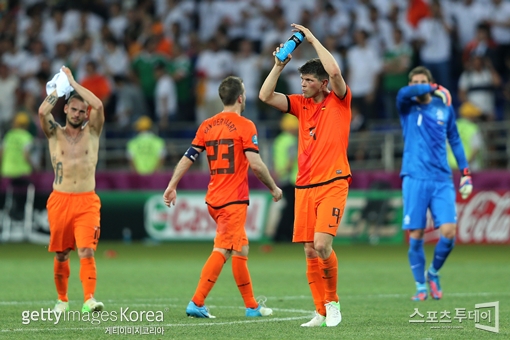 [스포츠투데이 김흥순 기자]네덜란드가 2012 유럽축구선수권대회(유로 2012) 예선 탈락의 위기에 몰렸다. 네덜란드는 14일 오전 3시45분(한국시간) 우크라이나 하리코프 메탈리스트 스타디움에서 열린 대회 B조 조별리그 2차전에서 숙적 독일에 1-2로 패했다. 덴마크와의 1차전 충격 패에 이어 2연패를 당한 네덜란드는 자력으로 8강에 오를 수 있는 기회를 잃었다. 오는 18일 포르투갈과의 마지막 경기에서 두 골차 이상 승리를 거두고 상대 팀 결과를 지켜봐야하는 상황이다. 반면 2승으로 B조 선두에 나선 독일은 마지막 덴마크와의 경기에서 두 골차 이상으로 패하지 않으면 8강에 오른다. 경기 초반 주도권은 네덜란드가 잡았다. 그러나 독일은 전반 24분 슈바인슈타이거의 침투패스에 이은 마리오 고메스의 오른발 슈팅으로 선제골을 터뜨리며 앞서나갔다. 기세가 오른 독일은 전반 37분 고메스의 추가골을 보태 두 골 차로 달아났다. 반격에 나선 네덜란드는 후반 들어 라파엘 판 데르 파르트와 클라스 얀 훈텔라르를 교체로 투입하며 전열을 가다듬었다. 결국 후반 28분 로빈 판 페르시의 만회골이 터지며 추격의 발판을 마련했다. 이후 네덜란드는 총공세를 펼치며 맞섰다. 그러나 상대 밀집수비에 막혀 동점골을 넣는데 실패했고 경기는 독일의 승리로 종료됐다. 한편 같은 조의 포르투갈은 덴마크를 3-2로 힘겹게 따돌리고 1패 뒤 첫 승을 신고했다. 나란히 1승1패를 거둔 두 팀 역시 예선 최종전 결과에 따라 8강행이 결정된다. 스포츠투데이 김흥순 기자 sport@<ⓒ아시아경제 & 재밌는 뉴스, 즐거운 하루 "스포츠투데이(stoo.com)">