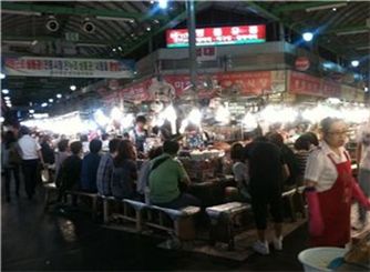 12일 오후 7시40분에 찾은 서울 종로구 광장시장에서 만난 조성미(55·여·가명)씨는 광장시장과의 30년전 추억을 회고했다. 그는 “고향인 충북 청주에서 올라와 광장시장에 처음 왔을 땐 없는 게 없어 정말 신기했다”고 말했다. 안파는게 없던 그 시절과는 달리 지금 광장시장의 모습은 크게 변했다.‘먹거리 장터’로 모습을 바꿨다. 시장의 대표 선수로 ‘음식’이 자리하게 된 것이다. 실제로 이날 해질무렵 광장시장 입구에 들어서자 음식점에 달린 주황색 불빛들이 시장을 환하게 밝히고 있었다. 빈대떡, 순대, 돼지껍데기, 잔치국수 등 다양한 음식들의 구수한 냄새도 시장을 찾는 사람들의 코를 자극하고 있었다.특히 저렴한 가격덕분에 시장에 먹을거리를 찾아 오는 사람들이 끊이지 않는 모습이었다. 시장의 한 빈대떡집에서 만난 이모(58·은평구)씨는 “둘이선 2만원이면 충분하다”며 “요즘 이런데가 어디있냐”고 되물었다. 빈대떡을 안주로 막걸리를 마시던 그는 “광장시장은 싸고 푸짐해서 수십년 째 단골”이라고 너털웃음을 지었다.이씨가 있던 이 빈대떡집은 방송과 인터넷 등을 통해 알려지면서 유명세를 타고 있는 곳으로 10년째 빈대떡을 4000원에 판매하고 있다. 빈대떡집 한 점원은 “경기가 안 좋아지면서 손님들이 늘었다”며 “시중에 돈이 없으니 싼 가격에 막걸리 한 잔 할 수 있는 곳을 찾는 것 같다”고 말했다.광장시장에서 만난 먹을거리의 가격은 대부분 1만원 안쪽이었다. 빈대떡은 4000원, 고기완자 2000원. 순대 6000원, 막걸리 3000원 등 서민들이 찾을 수 밖에 없는 이유가 있었던 셈이다.그러나 광장시장이 처음부터 이런 모습이었던 것은 아니다. 100여년의 역사를 가진 광장시장은 한복을 비롯한 의류, 직물, 원단 전문 시장으로 이름을 크게 알리고 있다. 지금도 여전히 한복 등 의류관련 제품이 다른 시장에 비해 큰 비중을 차지하고 있지만 이보다 먹을거리로 더 이름을 알리고 있는 것이 현실이다. 40여 년 동안 광장시장 입구에서 채소를 팔아온 김모(여)씨는 “광장시장의 대표선수가 바뀌고 있다”며 “관광객들이 많이 찾으면서 한복집 등은 점점 줄어들지만 음식점들은 많아지는 추세”라고 설명했다.12일 오후 찾은 서울 종로구 광장시장은 사람들로 붐볐지만 일찍 문을 닫은 점포도 눈에 띄었다.