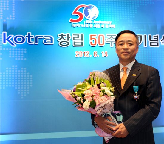 [아시아경제 오현길 기자]신우성 한국바스프 대표는 14일 서울 염곡동 코트라 본사에서 열린 ‘코트라 창립 50주년’ 기념식에서 산업포장을 수상했다.신 대표는 1984년 바스프에 입사해 약30년간 국내 화학업계에 신기술 도입과 더불어, 고용 창출, 수출 증대 등 관련 국내 산업에 부가가치를 창출했으며, 외환 위기 이후 현재까지 성공적으로 투자유치를 도모하며 국가발전에 기여하는 등 그 공로를 인정받아 이번 산업포장 수상의 영예를 안았다. 코트라가 올해 창립 50주년을 맞이해 '더 큰 시장, 더 큰 미래를 여는 국가무역투자 인프라' 라는 주제로 개최한 이번 ‘코트라 창립 50주년’ 기념식은 국내, 외 주요인사들이 참석한 가운데 다양한 축하 행사와 함께 개최됐다.