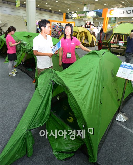 [아시아경제 윤동주 기자] 14일 서울 강남구 삼성동 코엑스에서 열린 '코리아 오토캠핑쇼'를 찾은 관람객들이 에코로바의 오토캠핑용 텐트와 침낭을 보고 있다.윤동주 기자 doso7@<ⓒ세계를 보는 창 경제를 보는 눈, 아시아경제(www.asiae.co.kr) 무단전재 배포금지>