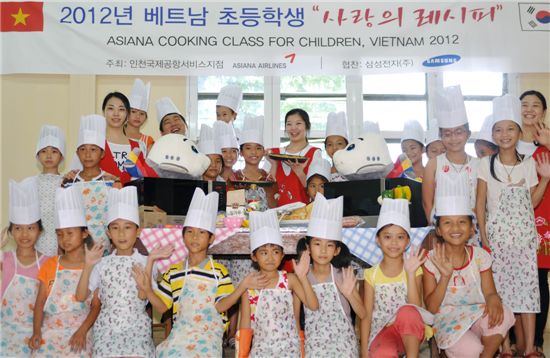 14일 아시아나항공 인천국제공항서비스지점 직원들이 베트남 탕와이현 한·베협력센터에서 현지 어린이들과 쿠키, 피자 등을 직접 만드는 '사랑의 레시피' 행사를 마친 후, 기념촬영을 하고 있다.