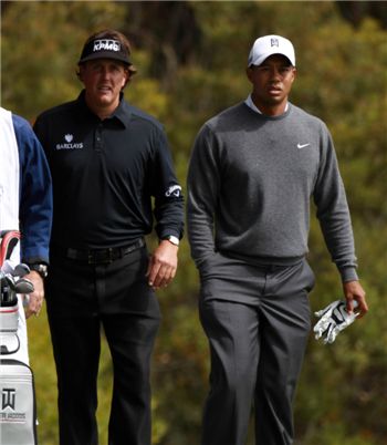 [아시아경제 김현준 골프전문기자] ○…타이거 우즈(미국ㆍ오른쪽)와 필 미켈슨(미국)이 15일(한국시간) 미국 샌프란시스코 인근 올림픽골프장(파71ㆍ7170야드)에서 열린 112번째 US오픈(총상금 800만 달러) 1라운드에서 굳은 표정으로 플레이하고 있다. 미국프로골프(PGA)투어에서 평소에도 사이가 좋지 않기로 소문난 사이다. 첫날 성적도 상반된 결과다. 우즈는 1언더파로 쾌조의 스타트를 끊었지만 미켈슨은 트레이드마크인 숏게임 마저 난조를 보이며 6오버파로 속절없이 무너져 100위권 밖으로 추락했다. 사진=스튜디오PGA 제공.김현준 골프전문기자 golfkim@<ⓒ세계를 보는 창 경제를 보는 눈, 아시아경제(www.asiae.co.kr) 무단전재 배포금지>