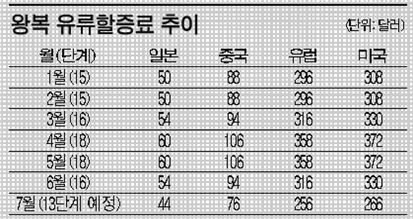 13단계 책정 예정…美 왕복 31만원대 전월非 7만원↓[아시아경제 조슬기나 기자]다음달 국제선 항공운임에 부과되는 유류할증료가 올해 최저수준까지 내려간다. 최근 국제유가 하락세가 반영된 것으로, 7월 미주지역을 왕복하는 승객이 지불해야하는 유류할증료는 한화 31만원대로 전월 대비 7만원 이상 낮아졌다.15일 관련업계에 따르면 대한항공, 아시아나항공 등 국적 대형항공사들의 7월 국제선 유류할증료는 전월보다 세 단계 하락한 13단계로 책정될 예정이다. 이는 연중 최저치로, 올 들어 가장 높았던 4~5월의 18단계 대비 5단계 낮고 1월 대비로도 2단계 이상 떨어진다.유류할증료 인하 추이에 따라 7월 이후 해외여행을 계획하고 있는 여행객들의 부담이 소폭 줄어들 전망이다. 올 들어 가파른 상승세를 보이던 유류할증료는 지난달 처음으로 전월 대비 하락세를 나타낸데 이어, 이달까지 두달 연속 내리막을 걷고 있다.내달 대표적 장거리 노선인 미국은 인당 왕복항공권을 기준으로 전월 대비 64달러 내린 266달러의 유류할증료가 부과된다. 새로운 유류할증료 체제로 개편된 올해 1월 이후 미주노선 왕복 유류할증료가 300달러 이하로 내려간 것은 이번이 처음이다. 이날 미국달러에 대한 원화환율이 1166원 안팎임을 감안할 때 한화로 31만원선에 해당하는 금액이다. 전월 대비로는 7만원, 전전월 대비로는 12만원이상 떨어진다.유럽, 아프리카노선의 7월 유류할증료는 전월 316달러에서 이달 256달러로 60달러가량 내려갔다. 같은 기간, 서남아시아 및 독립국가연합(CIS)노선은 28달러 인하된 120달러, 동남아시아, 괌 노선은 24달러 내린 124달러로 책정됐다. 운항거리가 가장 짧은 일본과 중국 산둥성 지역의 칭다오, 지난, 웨이하이, 옌타이 노선 등은 44달러, 기타 중국과 홍콩노선은 76달러로 결정된다.7월 국제선 유류할증료는 5월 16일부터 6월 15일까지 싱가포르 국제석유시장에서 거래된 항공유(MOPS) 평균 가격에 따라 결정된다. 14일 기준 평균가격은 갤런당 277.29센트를 기록했다.