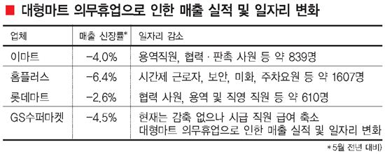 박이준 한재미나리영농법인 대표는 “일요일 의무휴업으로 인해 법인매출 타격이 연중 15% 수준인 15억원 정도가 될 것으로 예상된다”며 “사실상 대책이 없어 농가 피해가 막심할 것으로 안다”고 근심을 표했다. 수산물도 상황은 거의 다르지 않다. 대형마트에 생고등어와 자반을 납품하는 세동상사는 연매출 150억원 중 대형마트와의 거래량이 약 120억원에 달한다. 박태근 세동상사 부사장은 부산공동어시장에서 중매인으로도 활동중인데 재래시장상인을 보호하기 위한 법 자체엔 공감을 하지만 안정적인 판로를 제공하고 있는 대형마트 의무휴업에 대해서는 납득할 수 없다는 반응이다. 마트와 거래하고 있는 대부분 협력업체 자체가 중소상인인데 평일 물량의 2배 가량 판매되는 일요일을 월 2회 쉬는 것은 평일 5회 이상 매출과 맞먹는 수준이기 때문이다. 그는 “현재 주6일 근무를 하는데 대형마트 휴무에 따라서 토요일을 쉬게 되면 공장을 주5일로 가동해야 하고 그렇게 되면 작업량이 줄어 생계 때문에 하루라도 돈을 더 벌려는 직원들이 힘들어 하고 있다”고 분위기를 전했다. 매출 근무시간 감소따라 일자리·급여 문제도그밖에 롯데마트와 SSM 대표 기업 중 하나인 GS수퍼마켓의 경우도 매출이 전체적으로 하락했다. 롯데마트의 경우 지난 5월 매출 신장률이 전년대비 -2.6%를 기록했다. 물가상승률이 약 2~3%로 볼 때 자연신장률도 약 2~3%는 높아져야 하는데 오히려 마이너스(-)대를 기록해 대형마트 의무휴업으로 인해 매출이 줄고 있음을 보여준다. GS수퍼마켓은 지난해 동기간 대비 지난 5월 한 달 매출이 약 4.5% 하락했다. GS리테일 관계자는 “휴업으로 인해 어느 특정 품목만 영향을 받는 것이 아니라 전체적인 매출이 떨어지고 있다”며 “매출 감소 영향을 최소화하기 위해 주중 판촉을 강화하고 있다”고 하소연했다. 이 관계자는 또한 “이번 매출 감소로 인해 아직까지 근무인원 감축은 없으니 휴무에 따라 근무시간이 감소함에 따라 시급직원들의 급여에는 영향을 미칠 것”이라고 설명했다. 이렇게 대형마트와 SSM 매출의 역신장 현상이 두드러지고 관련 납품 및 생산업체도 영향을 받음에 따라 내수부진과 지역경제에 미칠 부정적 여파에 대한 우려의 목소리도 높다. 황인학 한국경제연구원 기업정책연구실 수석연구위원은 “대형마트 규제가 내수에 미칠 영향은 긍정적일 수 없다”며 “마트의 판매량 감소는 납품량 감소로 이어지고 이것은 납품업체의 매출과 영업일수, 고용자 수 등에 영향을 미쳐 결국엔 악순환 구조에 빠지게 될 우려가 있다”고 지적했다. 조현수 평택대 무역학과 교수는 “마트나 시장은 유기적으로 움직이는 활동체로 봐야 하는데 법적 제한을 가하는 것은 시장이 발전, 변화해 나가는 방향에 벽을 세우는 것이나 마찬가지”라며 “대형마트 의무휴업이 재래시장에 어느 정도 영향을 줄 수는 있겠지만 근본적인 대안은 못된다”고 강조했다.이코노믹 리뷰 김은경 기자 kekisa@<ⓒ 이코노믹 리뷰(er.asiae.co.kr) - 리더를 위한 고품격 시사경제주간지, 무단 전재 및 재배포 금지>