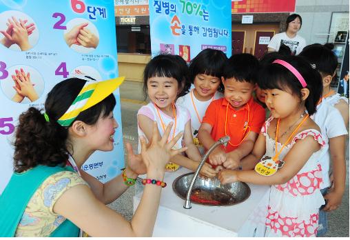 이동식 손 세정기를 이용해 ‘올바른 손씻기 6단계 방법’을 체험하고 있다.