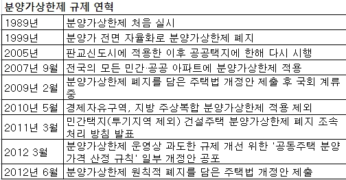 [아시아경제 진희정 기자]정부는 물론 주택건설업계가 지속적으로 주창해온 분양가상한제 폐지가 현실화된다. 국회의 법 개정안 통과가 여전히 숙제로 남아있으나 정부의 의지는 어느때보다 강하다.정부가 직접 상한제 폐지법안을 마련한 것은 그만큼 필요성이 크다는 판단에서다. 주택시장 침체가 지속되며 소비자 우위로 분위기가 전환된 것이 직접적 이유다. '착한 분양가'를 내세워야 팔리는 여건 속에서 분양가를 직접적으로 규제할 필요가 없다는 얘기다. 상한제가 폐지되면 분양가가 천정부지로 치솟을 것이란 '정치적 주장'은 더이상 현실성이 없다는 뜻이기도 하다.이 같은 상황을 반영하듯 최근 지자체 분양가 심의위원회의 역할은 유명무실해지고 있다. 법에 규정된 대로 분양가를 산출한 것보다 훨씬 낮은 금액으로 분양하겠다는 사업장이 속출하고 있어서다.◆정부, 상한제 폐지 추진 왜 나섰나= MB정부가 들어서면서 지속적으로 제기돼온 분양가상한제 폐지 이슈는 공전을 거듭해왔다. 국회에서도 폐지법안이 발의됐지만 3년 넘게 표류됐다. 정치적 부담을 느낀 국회의원들이 상임위에서 정식 의제로 다루지도 못해서다.지난 2009년 2월 민간택지 상한제 폐지를 담은 장광근 의원 대표발의 개정안에 이어 전용면적 85㎡ 초과 주택 및 민간택지 상한제 폐지(신영수 의원), 경제자유구역 내 공동주택 및 관광특구 내 초고층 주택 상한제 폐지(현기환 의원) 등이 잇따라 나왔다. 이 가운데 경제자유구역내 50층 이상에 대해서만 상한제가 폐지됐다.