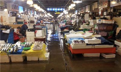 빨리 찾아온 여름에 수산시장은 손님들의 발걸음이 뚝 끊겼다. 14일 텅빈 시장길 사이로 상인들이 손님을 기다리고 있다.