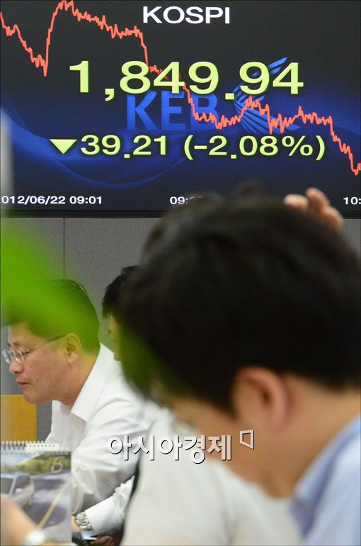 [아시아경제 윤동주 기자] 코스피지수가 글로벌 경기침체 우려로 급락하면서 장을 시작한 22일 서울 중구 외환은행 딜링룸의 딜러들이 바쁘게 움직이고 있다.윤동주 기자 doso7@<ⓒ세계를 보는 창 경제를 보는 눈, 아시아경제(www.asiae.co.kr) 무단전재 배포금지>