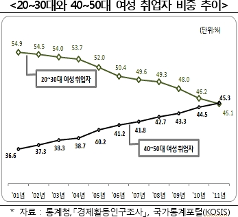 [아시아경제 김종수 기자]지난해 서울에서 40~50대 여성취업자 수가 20~30대보다 높았던 것으로 나타났다. 이는 서울시가 1995년 통계를 작성한 이래 처음이다. 24일 서울시 정보화기획단이 발표한 '통계로 본 서울여성의 경제활동'에 따르면 지난해 여성취업자 중 40~50대의 비중이 45.3%로 20~30대(45.1%)를 처음으로 추월한 것으로 집계됐다. 취업자 수는 40~50대가 98만명, 20~30대가 97만7000명을 각각 기록했다. 10년 전과 비교해 20~30대가 10만1000명(9.4%) 줄어든 데 반해 40~50대는 26만2000명(36.5%)이나 늘었다.그러나 고용의 질적인 측면에서는 20~30대가 나은 것으로 조사됐다.20~30대 여성은 전문·관리직 및 사무직이 69.7%인 반면, 40~50대는 서비스·판매직이나 단순 노무직이 56.3%, 기능직이 11.3%를 차지했다. 박영섭 정보화기획담당관은 이런 연령별 취업구조의 변화 원인으로 "20~30대는 학력 상승으로 인한 취업 지연, 취업난, 육아부담으로 취업을 포기하고 있는 반면, 40~50대는 자녀교육비나 노후자금 비축 등 경제적인 필요로 다시 경제활동에 참여하고 있기 때문"으로 분석했다. 또 '중단없이 계속 취업을 해야한다'는 생각은 지난 98년 32.7%에서 지난해 48.0%로 증가해 여성들이 경력 단절없는 취업을 원하고 있는 것으로 조사됐다. 그러나 이상과 달리 현실은 출산과 육아로 인해 경제활동이 꺾이는 'M자형' 흐름이 여전한 것으로 나타났다. 이를 반영하듯 출산 및 육아에 직면한 연령층인 30대 여성 고용률은 남성에 비해 28.6%p나 낮게 나타났다. 한편 25~39세 서울 미혼·독신여성은 2000년 7만6282명에서 2010년 15만7명으로 10년 새 96.6%나 증가한 것으로 조사됐다. 또 독신여성의 학력은 78.4%가 대학졸업 이상으로, 81.8%가 경제활동을 하고 있고, 이들의 직업별 분포를 보면 70.3%가 전문·관리직 및 사무직인 것으로 파악됐다.