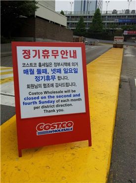 그 가운데 일부는 정부 정책에 문제가 있다며 강하게 비난하기도 했다. 서울 동작구 상도동에서 코스트코를 찾았다는 박삼조씨 "연회비 내고 코스트코를 이용하는데 이는 어떻게 보상할거냐"라면서 "재래시장은 주차가 불편하고 여기 있는 물건이 거기에 없는 경우가 많다"며 격분했다. 그는 이어 "강제로 휴무 조치를 내려도 여기 올 사람은 온다"며 "내일 오전에 장 보러 다시 올 예정"이라며 차를 돌렸다.▲24일 서울 양재동 코스트코홀세일 주차장 입구. 정기휴무를 알리는 표지판이 세워져 있다.