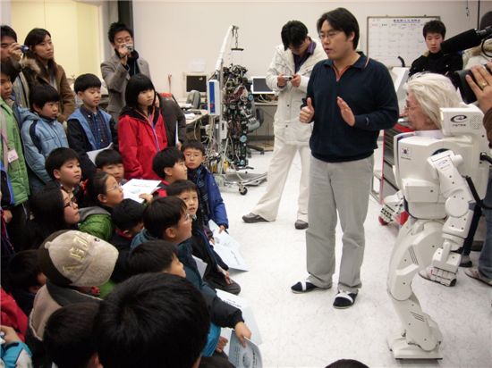 지난 겨울방학 때 대전에서 열린 과학영재캠프에서 참가학생들이 휴머노이드로봇 '휴보'와 만나고 있다.