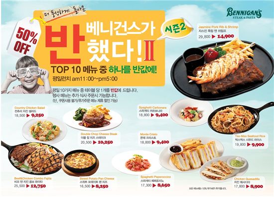 [아시아경제 오주연 기자] 베니건스가 올 상반기 가장 많이 판매된 톱 10메뉴를 반값에 제공한다.베니건스는 고물가 시대를 맞아 샐러드, 파스타, 스테이크 등 인기있는 메뉴 10개를 50% 할인판매한다고 28일 밝혔다.이번 행사는 다음달 1일부터 2달 동안 평일 11시부터 오후 5시까지 진행되며 2인부터 4인까지 푸짐하게 즐길 수 있는 반값 세트메뉴와 경품이벤트까지 마련해 더욱 다채롭게 준비했다.