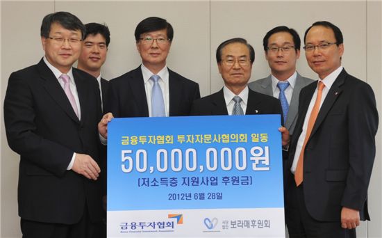 [아시아경제 서소정 기자]한국금융투자협회(회장 박종수)와 투자자문사협의회(회장 한규봉)는 28일 서울 여의도 금융투자협회 23층에서 보라매후원회(회장 김종수)에 후원금을 전달했다.이번 후원으로 연 500만원씩 10년간 총 5000만원이 보라매후원회에 지원되며, 후원금은 저소득층 등 상황이 어려운 사람들을 위한 지원사업에 쓰일 예정이다.이날 행사에는 박종수 금융투자협회장, 김종수 보라매후원회장(보라매병원 마취통증의학과 교수), 강승백 이사(보라매병원 정형외과 교수), 한규봉 투자자문사협의회 회장(가울투자자문 대표), 유두영 튜브투자자문 대표, 김민국 브이아이피투자자문 대표가 참석했다.한규봉 투자자문사협회의회회장은 "이번 후원은 최근 수익악화로 자문업계가 어려운 가운데에도 뜻을 모아 작은 나눔을 시작한 것"이라며 "앞으로 기회가 되는대로 다양한 사회공헌 활동에 참여할 계획"이라고 말했다.서소정 기자 ssj@<ⓒ세계를 보는 창 경제를 보는 눈, 아시아경제(www.asiae.co.kr) 무단전재 배포금지>