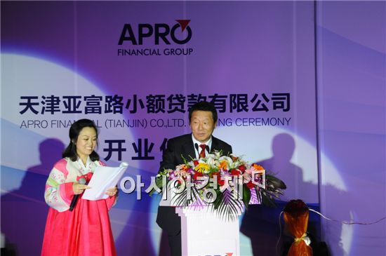 최윤 아프로파이낸셜 그룹 회장이 지난 29일 중국 톈진시에서 열린 현지법인 '톈진아부로(亞富路)소액대출유한공사' 개업식에 참석, 인사말을 하고있다.