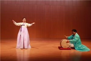 크라운-해태제과가 주최하는 한국의 풍류 일본공연에서 양주풍류악회 안숙선 명창이 홍보가를 부르고 있다.