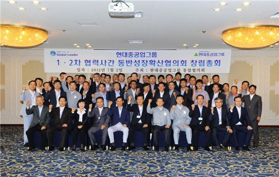 현대중공업은 2일 울산 전하동 호텔현대울산에서 그룹 3사의 협력사 모임인 현중그룹통합협의회가 주축이 돼 '현대중공업그룹 동반성장확산협의회'를 발족했다.이에 따라 현대중공업을 비롯한 현대미포조선·현대삼호중공업 등 현대중공업그룹 조선 3사와 거래하는 1차 협력사들은 2차 협력사 및 영세 중소기업으로 동반성장을 확산시키는 데 앞장서기로 했다.이날 동반성장확산협의회 창립총회에는 현중그룹통합협의회장인 송정석 삼강금속 대표(앞줄 가운데)를 비롯해 1?2차 협력회사 대표와 현대중공업 관계자 등 60여명이 참석했다.박민규 기자 yushin@<ⓒ세계를 보는 창 경제를 보는 눈, 아시아경제(www.asiae.co.kr) 무단전재 배포금지>