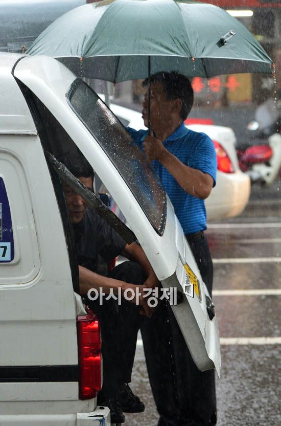 [아시아경제 양지웅 기자] 3일 오후 중부 지방에 천둥ㆍ번개 동반한 소나기가 내리는 가운데 서울 명보사거리 인근에서 한 운송기사가 트렁크에 앉아 비를 피하고 있다. 양지웅 기자 yangdoo@<ⓒ세계를 보는 창 경제를 보는 눈, 아시아경제(www.asiae.co.kr) 무단전재 배포금지>