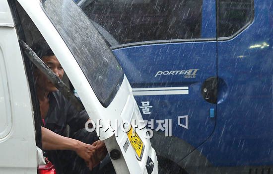 [아시아경제 양지웅 기자] 3일 오후 중부 지방에 천둥ㆍ번개 동반한 소나기가 내리는 가운데 서울 명보사거리 인근에서 한 운송기사가 트렁크에 앉아 비를 피하고 있다. 양지웅 기자 yangdoo@<ⓒ세계를 보는 창 경제를 보는 눈, 아시아경제(www.asiae.co.kr) 무단전재 배포금지>