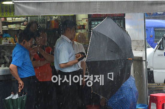 [아시아경제 양지웅 기자] 3일 오후 중부 지방에 천둥ㆍ번개 동반한 소나기가 내리는 가운데 시민들이 서울 명보사거리 인근 분식집 천막 아래서 비를 피하고 있다.양지웅 기자 yangdoo@<ⓒ세계를 보는 창 경제를 보는 눈, 아시아경제(www.asiae.co.kr) 무단전재 배포금지>