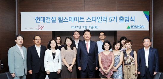 김형일 현대건설 건축사업본부장 전무(가운데)와 회사 관계자들이 힐스테이트 스타일러 5기로 선발된 주부 5명과 기념촬영을 하고 있다.
