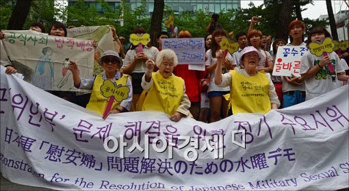 [아시아경제 윤동주 기자] 4일 서울 종로구 주한일본대사관 앞에서 열린 위안부 할머니들을 위한 수요집회에서 할머니들이 일본 정부의 사죄를 요구하는 구호를 외치고 있다.윤동주 기자 doso7@<ⓒ세계를 보는 창 경제를 보는 눈, 아시아경제(www.asiae.co.kr) 무단전재 배포금지>