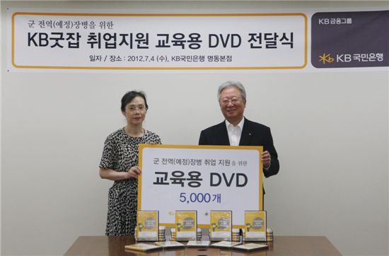 이찬근 KB국민은행 기업금융그룹 부행장(사진 오른쪽)과 김송애 국방부 전직지원정책과장(사진 왼쪽)이 KB굿잡 취업 교육용 DVD전달식 이후 기념 촬영을 하고 있다.