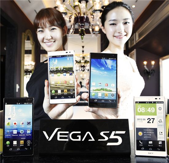 스타일과 그립감을 동시에 만족시킨 ‘베가S5’가 출시돼 국내 대화면 스마트폰 시장에서 경쟁이 가속화될 전망이다. 사진은 모델들이 ‘베가S5’를 손에 쥐고 포즈를 취하고 있다.