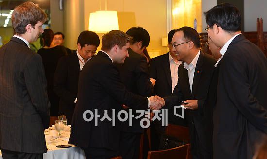 [아시아경제 양지웅 기자] 박재완 기획재정부 장관이 6일 서울 태평로 한국프레스센터에서 열린 외신기자클럽 오찬간담회에서 기자들과 인사를 나누고 있다. 양지웅 기자 yangdoo@<ⓒ세계를 보는 창 경제를 보는 눈, 아시아경제(www.asiae.co.kr) 무단전재 배포금지>
