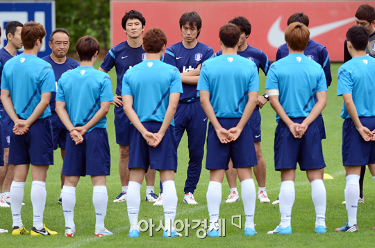 [아시아경제 정재훈 기자] 2012 런던 올림픽을 앞둔 올림픽 축구 대표팀이 6일 오후 파주NFC에서 훈련을 가졌다. 훈련에 앞서 선수들에게 전달사항을 말하는 홍명보 감독.정재훈 사진기자 roze@<ⓒ세계를 보는 창 경제를 보는 눈, 아시아경제(www.asiae.co.kr) 무단전재 배포금지>