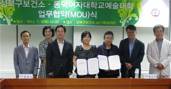 성북구 보건소와 동덕여자대학교 예술대학이 5일 오후, 학생들의 보건소 이용 편의 제공, 보건사업을 위한 미술작품 제공, 학생들의 지역사회 봉사활동 지원 등의 내용이 담긴 ‘건강성북을 만들기 위한 업무협약’을 맺었다. 사진 오른쪽 세 번째부터 홍순주 동덕여대 예술대학장과 황원숙 성북구 보건소장. <br /> <br />