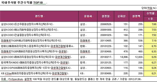 [아시아경제 서소정 기자]국내주식형펀드의 주간수익률이 한주만에 플러스로 전환했다. 8일 에프앤가이드에 따르면 지난주 국내주식형 펀드의 수익률은 2.71%를 기록했다. 소유형별로는 KOSPI200지수 또는 섹터지수 이외의 특정지수에 따라 운용되는 인덱스주식기타가 4.30%의 수익률로 가장 높은 수익률을 나타냈다. 이어 특정 업종이나 섹터지수에 따라 운용되는 인덱스주식섹터가 3.43%로 우수한 성과를 보였다. 코스피200지수에 따라 운용되는 인덱스주식코스피200은 3.18%의 수익률을 기록했다. 반면 중소형주에 주로 투자하면서 적극적운용을 하는 액티브주식중소형은 1.26%의 성과로 저조한 수익률을 보였다. 국내주식형펀드 수익률 상위는 상장지수펀드(ETF)와 주가지수선물 등에 투자하는 레버리지 펀드가 대거 차지했다. '삼성KODEX조선주증권상장지수투자신탁[주식]'과 '삼성KODEX에너지화학증권상장지수투자신탁[주식]'은 각각 7.68%, 7.53%의 수익률로 가장 우수한 성과를 보였다. 상장지수펀드(ETF)를 제외하면 인덱스주식기타형인 '한화2.2배레버리지인덱스증권투자신탁[주식-파생재간접형]종류A'와 '삼성KOSPI200레버리지증권투자신탁 1[주식-파생재간접형](A)'이 각각 6.70%, 6.24%의 높은 수익률을 기록했다.해외주식형펀드도 3.57%의 수익률로 한주만에 플러스 수익률로 전환했다. 지역별로는 중남미가 5.71%로 가장 우수한 수익률을 나타냈다. 이어 러시아(5.70%), 브라질(5.51%), 인도(5.37%) 등에서 양호한 수익률을 기록했다. 반면 중국본토(1.08%)는 저조한 수익률을 기록했으며, 중동아프리카(1.16%), 일본(2.10%), EMEA(2.11%) 등의 지역에서 부진한 성과를 보였다.해외주식형 펀드에서는 러시아와 브라질 지역에 투자하는 펀드가 상위에 포진했다. '미래에셋러시아업종대표증권자투자신탁 1(주식)종류A'가 7.31%의 수익률로 가장 우수한 성과를 보였고, '프랭클린템플턴내츄럴리소스증권자투자신탁[주식-재간접형]Class A'가 7.19%의 수익률로 뒤를 이었다. 'KB인디아증권자투자신탁(주식)A'는 6.85%의 수익률을 기록했다.채권시장에서는 국내채권형펀드는 0.08%를 기록한 반면, 해외채권형펀드는 0.95%의 수익률을 거뒀다. 해외채권형펀드 중 신흥국에서 발행된 채권에 주로 투자하는 신흥국채권이 1.68%의 수익률로 우수한 성과를 나타냈다. 서소정 기자 ssj@<ⓒ세계를 보는 창 경제를 보는 눈, 아시아경제(www.asiae.co.kr) 무단전재 배포금지>