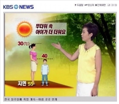 [아시아경제 박충훈 기자]'키가 커야 하는 이유'에 대한 방송캡쳐 게시물이 네티즌에게 화제가 되고 있다. 이 게시물에는 KBS 뉴스 기상예보 시간에 소개됐던 '무더위 속 아이가 더 더워요'라는 내용이 담겨있다.지면이 섭씨 55도일 때 체감 온도는 키가 큰 어른의 경우 30도, 상대적으로 키가 작은 어린이는 40도에 해당한다는 내용이다. 따라서 어린이들이 어른보다 더위를 더 많이 탄다는 것.이 게시물은 수년전 나온 것으로, 키가 작은 사람의 서러움을 표현한 게시물에 자주 등장한다. '소녀시대 태연이 더위타는 이유' 같은 패러디도 양산됐다.