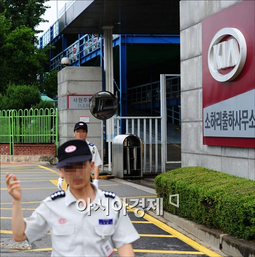 [아시아경제 윤동주 기자] 현대·기아차 노조가 4년 만에 파업에 들어간 13일 경기도 광명시 기아자동차 소하리 공장에 관계자들이 외부의 출입을 막고 있다.윤동주 기자 doso7@<ⓒ세계를 보는 창 경제를 보는 눈, 아시아경제(www.asiae.co.kr) 무단전재 배포금지>