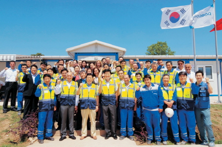 ▲세계철강협회 집행위원회 참석차 터키를 방문한 정준양 포스코 회장(앞줄 왼쪽 세번째)은 지난 10일 집행위 참석에 앞서 연산 20만t 규모 스테인리스냉연공장 건설현장을 둘러보고 임직원을 격려했다.