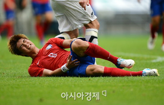 [아시아경제 정재훈 기자] 14일 오후 서울월드컵경기장에서 열린 '하나은행 초청 올림픽대표팀 출정식' 대한민국과 뉴질랜드의 경기에서 기성용이 상대 선수의 태클에 걸려 넘어지며 고통스러워하고 있다.정재훈 사진기자 roze@<ⓒ세계를 보는 창 경제를 보는 눈, 아시아경제(www.asiae.co.kr) 무단전재 배포금지>