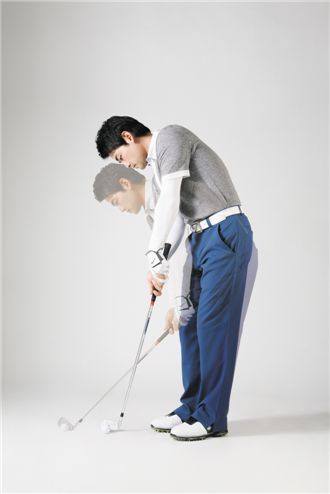 [사진1] 어드레스에서 몸의 각도가 변하면 손의 높이도 달라져 클럽의 양끝이 들리고 결국 공이 좌우로 날아간다.