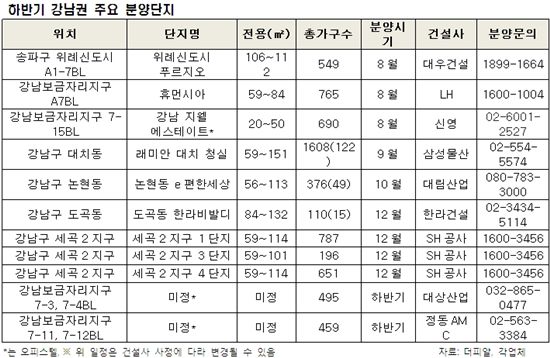 [아시아경제 박미주 기자]상반기 서울지역 신규 분양시장에서 강남권 아파트와 오피스텔이 높은 청약 경쟁률을 기록하며 눈길을 끌었다.18일 관련업계에 따르면 올 1월부터 6월까지 강남3구(강남·서초·송파)에서 분양한 아파트 5개 단지 중 4개 단지가 순위 내 마감됐다. 특히 지난달 20일 당첨자를 발표한 ‘래미안 강남힐즈’의 당첨자 최고가점이 79점을 기록하면서 올해 서울에서 청약을 받은 아파트 중 당첨자 최고가점을 기록했다.이 기간 강남 3구에 분양된 수익형 부동산 7개 단지 2378실도 높은 청약경쟁률을 보이며 마감됐다.업계 관계자는 “주거 선호도가 높은 강남 지역에서 재건축 일반분양이 연이어 공급되는 데다 시세보다 낮은 강남 보금자리 민간 중대형 아파트도 올해 첫 선을 보여 선택의 폭이 넓어졌다”면서 “강남 3구 투기과열지구 해제로 분양권 전매제한 기간도 1~3년으로 단축되면서 청약 문턱도 한결 낮아졌다”고 설명했다.하반기에도 서울 강남3구 노른자 입지에 10개 단지, 6280가구(실)가 분양된다. 위례신도시 민간분양, 강남보금자리 본청약 등 추가 분양될 물량이 많아 청약열기가 더욱 달아오를지 주목된다.◆송파구 위례신도시 A1-7블록 ‘위례신도시 푸르지오’= 대우건설이 오는 8월 서울 송파구 위례신도시 A1-7블록에서 ‘위례신도시 푸르지오’를 민간건설사 처음으로 분양한다. 이 아파트는 지하 2~지상 29층, 7개동 규모에 전용면적 106~112㎡, 총 549가구로 구성된다. 신도시 내에서도 입지 여건이 뛰어나고 기존 강남권 아파트에 비해 가격 경쟁력이 높아 수요들의 관심이 집중될 것으로 예상된다. 반경 500m 내 초·중·고교 모두 신설될 계획으로 도보로 통학할 수 있고 대치동 학원가도 가깝다. 단지 북쪽으로 장지천과 주제공원이 인접해 있고, 2㎞ 반경에 가든파이브와 이마트, CGV, NC백화점 등이 있다. 지하철 8호선 ‘복정역’을 이용할 수 있다. 지난 4월에는 서울시 우수 디자인 공동주택으로 선정되면서 외부 벽면 전체에 발코니 설치가 가능해 발코니 확장할 때 실제 사용 면적을 넓힐 수 있다.◆강남구 강남보금자리지구 A7블록 LH아파트= 같은 달 한국토지주택공사(LH)는 강남보금자리지구 A7블록에 10개 동, 전용 59∼84㎡로 구성된 보금자리주택 765가구 본청약을 받는다. 이곳은 서울 강남이 가까워 위례신도시와 함께 새로운 주거벨트가 될 전망이다. 지난해 말부터 착공을 시작해 오는 2014년을 완공을 목표로 하고 있다.◆강남구 대치동 ‘래미안 대치 청실’= 삼성물산 건설부문은 9월 강남구 대치동 633번지 일대의 대치 청실아파트를 재건축한 ‘래미안 대치 청실’을 분양한다. 단지 규모는 지하 4층, 지상 35층, 17개동, 전용 59~151㎡ 총 1608가구(임대 40가구 포함)의 대단지로 이중 전용 59㎡ 14가구와 84㎡ 108가구 총 122가구를 일반 분양한다. 지하철 3호선과 분당선 도곡역과 3호선 대치역을 모두 걸어서 이용할 수 있고, 경부고속도로 외곽순환도로 등이 도로망 이용도 수월하다. ◆강남구 논현동 ‘논현동 e편한세상’ · 강남구 도곡동 ‘도곡동 한라비발디’ = 10월 대림산업이 강남구 논현동 경복아파트를 재건축한 ‘논현동 e편한세상’ 376가구(일반분양 49가구)를, 12월에는 한라건설이 강남구 도곡동 동신아파트를 재건축한 ‘도곡동 한라비발디(가칭)’ 110가구(일반분양 15가구, 전용 84~132㎡)를 분양한다. ◆강남구 강남보금자리지구 7-15블록 ‘강남 지웰 에스테이트’= 신영은 오는 8월 강남보금자리지구 업무지구 7-15블록에 ‘강남 지웰 에스테이트’ 오피스텔을 공급할 예정이다. 지하 5~지상 10층 2개동 전용면적 20~50㎡ 총 690실로 구성돼 있다. 보금자리지구 초입에 위치하고 있어 지하철 3호선 수서역, 강남업무지역 등으로 접근성이 좋은 것이 특징이다.박미주 기자 beyond@<ⓒ세계를 보는 창 경제를 보는 눈, 아시아경제(www.asiae.co.kr) 무단전재 배포금지>