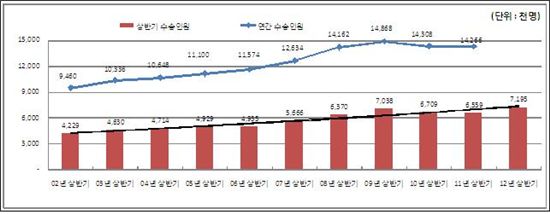 여수 신기~여천 항로 이용객 전년비 66%↑상반기 연안여객선 총 715만명 이용[아시아경제 조태진 기자]여수세계박람회 효과에 힘입어 인근 해상 뱃길을 이용하는 관광객이 크게 늘어난 것으로 나타났다.19일 국토해양부가 발표한 올해 상반기 연안여객선 수송 실적에 따르면 여수 돌산도와 금오도를 잇는 신기~여천 항로 이용객이 15만 190명으로 전년 동기 9만 474명보다 66% 급증했다. 여객선으로 완도와 제주를 오간 이용객도 24만 7625명으로 같은 기간 동안 42% 큰 폭으로 늘었다.여수엑스포 관람객 수송을 위해 개설된 엑스포~서상 항로도 행사 개막일인 5월 12일부터 6월말까지 6만 5000명(일평균 약 1300명), 엑스포~웅천 항로도 4만 4000명(일평균 약 880명)을 기록했다.이에 따라 국내 연안여객선 전체 이용객은 719만 5000여 명으로 지난해 같은 기간보다 10% 가량 증가했다. 국토부 관계자는 "여수엑스포 개최로 인근 항로 해상교통 이용객이 증가했다"며 "여기에 지난해에 비해 기상특보 및 안개 등에 의한 결항률이 줄어든 것도 이용객 증가로 이어졌다"고 말했다.이 밖에 인천 삼목~장봉(27%), 인천~백령(24%), 제주 모슬포~마라도(22%), 여수~거문도(21%) 항로도 20% 이상 증가했다. 대표적인 관광항로인 청산도~완도와 목포~홍도 구간도 각각 7%와 2% 소폭 증가세를 유지했다.국토부는 여수엑스포 관람객 증가와 함께 하계 휴가철이 본격화되면서 연안여객선 수송객이 지속적으로 늘어날 것으로 보고 안전관리 대책 마련에 적극 나설 방침이조태진 기자 tjjo@<ⓒ세계를 보는 창 경제를 보는 눈, 아시아경제(www.asiae.co.kr) 무단전재 배포금지>