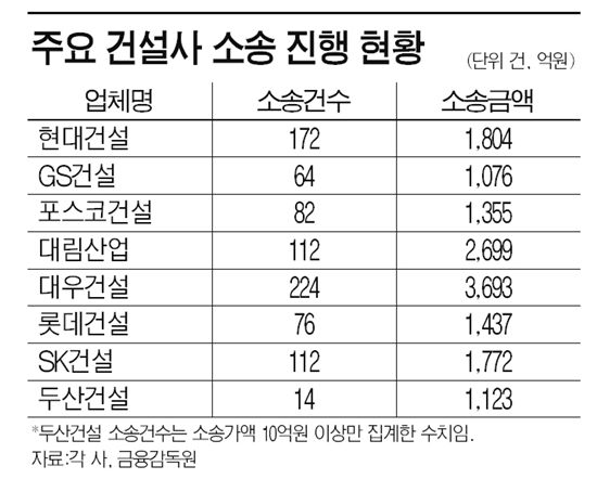 시공사에도 하자책임 주는 '집합건물법' 개정 땐 더 늘어날듯[아시아경제 조태진 기자]건설사들이 날로 커져가는 소송 리스크로 몸살을 앓고 있다. 특히 부동산 경기불황이 심해지면서 분양대금 반환청구, 주변 시세하락에 따른 분양가격 조정 시비가 급격하게 늘어나고 있다. 시행사 등으로부터 공사대금을 제때 받지 못해 건설사들이 법적 판단을 요구하는 경우도 빈번하다. 여기에 시공사 결함보수 책임 범위를 넓힌 '집합건물법 개정안'이 하반기 국회 통과를 앞두고 있어 건설사들의 소송 리스크는 더욱 커질 전망이다.20일 관련업계에 따르면 국내 1위 시공능력인 현대건설은 올 1분기 현재 법원에 계류된 소송금액이 1804억7400만원(172건)으로 전년 동기 1380억2400만원(121건) 보다 30.7%나 증가했다.분양단지 시행사, 재건축조합 등이 손해배상이나 부당이득금을 반환하라는 소송이 상당 수를 차지하고 있다. 지난 1월에는 경남 창원 '감계 힐스테이트' 시행사인 감계개발이 195억7500만원 상당 손배소를 제기하기도 했다.현대건설 관계자는 "분양 실적이 저조해지면서 시행사들이 피해를 최소화하기 위해 계약상 허점을 파고들어 소송을 제기하고 있는 실정"이라며 "한 달 평균 10건 정도 소송 심리가 진행되니 이틀에 한 번 꼴로 법원을 찾아야 하는 상황"이라고 말했다.다른 대형건설사의 경우도 사정은 비슷하다. 포스코건설의 경우 올해 1분기 현재 계류중인 소송 관련 금액이 1355억원(82건)으로 전년 동기 720억원(65건) 보다 88.2%나 늘었다. 대림산업도 3월 말 현재 2699억원으로 84.4%나 증가했다. 대우건설은 무려 3693억원(224건) 규모의 소송가액이 법원의 판단에 맡겨져 있는 상태다. 소송금액은 예측 불가능성이라는 특징 때문에 재무제표에 선반영하지 않는 경우가 대부분이다. 하지만 패소하게 되면 해당 금액은 우발채무로 분류돼 재무건전성에도 악영향을 미치게 된다.한 건설사 관계사는 "올해 들어서는 지자체가 발주한 수십억원 규모의 공사대금도 제때 주지 않아 법적 시비를 가려야할 판"이라며 "시공사가 마치 봉이라도 된 듯한 느낌을 받을 때도 있다"고 하소연했다.툭하면 소송을 거는 현상은 더욱 늘어날 것으로 보인다. 주택의 하자와 관련해 시공사에게 결함 책임을 물을 수 있도록 한 '집합건물 소유ㆍ관리에 관한 법률'(집합건물법) 개정안이 국회통과를 앞두고 있어서다. 오는 9월 정기국회에 제출될 예정인 집합건물법은 시행사가 부도 등 보상불능 상태에 빠지면 입주자가 시공사를 상대로 직접 손해배상책임을 물을 수 있도록 했다. 현행법은 시행사에게만 하자 책임을 물을 수 있도록 돼 있다. 법 개정안이 통과되면 집값 하락추세 속에 입주자들의 시공사에 대한 소송이 남발될 가능성이 높다. 전문브로커인 기획소송 변호사들이 개입해 소송을 부추길 수도 있을 것이란 지적이 나온다.건설사들에 대한 비우호적 환경이 조성되자 각 업체들은 대처 방안 마련에 분주하다. 현대건설은 소송 관련 업무효율성을 높이기 위해 각 사업본부에 소속된 변호사 인력을 감사실로 흡수했다. 삼성물산, 삼성중공업, 삼성엔지니어링 등 삼성그룹내 3개 건설계열사의 법무실을 한 곳에서 통합 운영하는 것과 비슷한 형태다. 몇몇 대형건설사들은 소송 관련 업무가 늘어나 경영리스크를 키우고 있는 만큼 변호사 전문인력을 충원할 계획이다. 조태진 기자 tjjo@<ⓒ세계를 보는 창 경제를 보는 눈, 아시아경제(www.asiae.co.kr) 무단전재 배포금지>