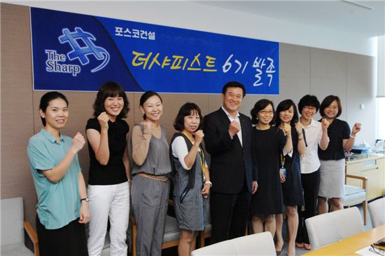 발족식 후 김철수 포스코건설 상무(왼쪽에서 5번째)와 더 샤피스트 자문인 이혜선 이화여자대학교 산업디자인 교수(왼쪽에서 3번째), 주부자문단이 기념촬영을 하고 있다.