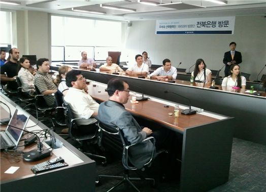 ▲19일 전북 전주시 덕진구 금암동에 위치한 전북은행 본점 9층 세미나실에서 파라과이 중기청 공무원들이 전북은행에 대한 설명을 듣고 있다.(사진: 전북은행)<br />