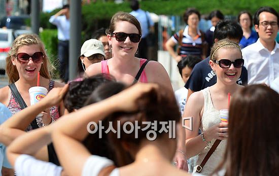 [아시아경제 양지웅 기자] 서울 낮 최고기온이 32도 까지 올라가는 등 전국에 무더위가 이어진 23일 서울 광화문 사거리에 외국인 관광객들이 선글라스를 쓰고 걸어가고 있다.양지웅 기자 yangdoo@<ⓒ세계를 보는 창 경제를 보는 눈, 아시아경제(www.asiae.co.kr) 무단전재 배포금지>