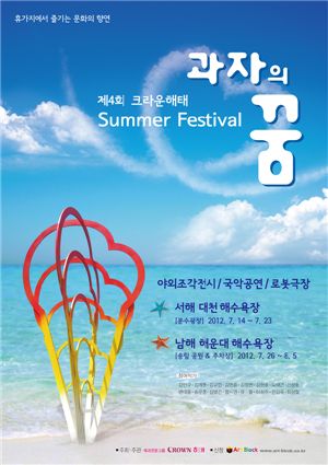 [아시아경제 이현주 기자]크라운 해태제과는 본격적인 휴가철을 맞아 다음달 5일까지 부산해운대 해수욕장 송림공원에서 '제4회 크라운 해태제과 썸머 페스티벌(Summer Festival) 과자의 꿈'을 개최한다고 26일 밝혔다.이번 전시회는 가족과 함께 휴가지를 찾은 고객들에게 야외 조각전시, 국악공연 감상 등의 문화행사를 제공한다.또 강민규, 이정주 등 크라운 해태 송추아트밸리 입주작가 11명을 포함해 크라운 해태 직원들이 참여해 직접 만든 작품 3점 등 총 19점의 작품을 선보일 예정이다.윤영달 크라운 해태제과 회장은 "올해로 4회째인 '과자의 꿈' 전시회는 고객이 원하는 곳으로 직접 찾아가는 특화된 아트마케팅 서비스"라며 "앞으로도 다양한 문화예술 공연을 통해 고객에게 가까이 다가가고, 소통할 계획"이라고 말했다. 이현주 기자 ecolhj@<ⓒ세계를 보는 창 경제를 보는 눈, 아시아경제(www.asiae.co.kr) 무단전재 배포금지>