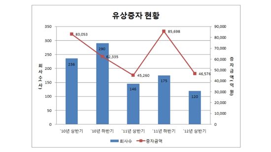 [아시아경제 김유리 기자]증시부진이 공모시장 침체로 이어지며 올해 상반기 유상증자 규모가 지난해 하반기에 비해 절반 가까이 줄었다. 26일 한국예탁결제원(KSD)에 따르면 올해 상반기 유상증자를 실시한 상장사는 120곳으로 증자 주식 수는 총 12억3900만주다. 증자 금액은 4조6576억원. 금액은 직전 반기대비 45.7% 줄었다. 지난해 하반기에는 대형증권사들이 프라임브로커 사업을 위해 대규모 유상증자를 진행하면서 증자금액이 늘어난 영향도 있으나, 전반적인 공모시장 침체가 보다 근본적인 원인으로 꼽히고 있다. 상반기 유상증자 규모는 전년동기대비로는 회사 수 17.8% 감소, 증자 주식 수 21.9% 증가, 증자금액은 2.9% 증가로 집계됐다. 유상증자 배정방식으로는 3자배정방식이 3조9800억원(8억8800만주)으로 전체 증자금액의 85.5%를 차지했다. 주주배정방식은 5.9%인 2734억원(2억4700만주), 일반공모방식은 5.6%인 2621억원(7000만주), 주주우선 공모방식은 3.0%인 1421억원(3400만주) 으로 나타났다. 예탁결제원 관계자는 "시장 상황이 안좋아 유상증자를 통한 자금조달방식 가운데서도 금융위원회 신고서 제출 등이 필요 없어 절차가 간소하고 단기자금조달이 비교적 쉬운 3자배정방식이 선호되고 있다"고 설명했다.유상증자 금액 면에서 상위 5개사는 SK하이닉스(2조3426억원), 금호산업(4회, 4523억원), 진흥기업(2108억원), 금호타이어(1730억원), 넥센(1610억원) 순이었다. 올해 상반기 무상증자는 43개사 2억1715만주로 지난해 상반기 42개사 1억9411만주보다 회사 수는 2.4%, 주식 수는 11.9% 증가했다.증권시장별로 보면 유가증권시장법인이 16개사 7642만주, 코스닥시장법인이 27개사 1억4073만주로 올해에도 코스닥 상장사들의 무상증자가 활발했던 것으로 나타났다. 무상증자 주식 수가 가장 많았던 회사는 코스닥시장의 셀트리온(5707만주)으로 집계됐다. 김유리 기자 yr61@<ⓒ세계를 보는 창 경제를 보는 눈, 아시아경제(www.asiae.co.kr) 무단전재 배포금지>